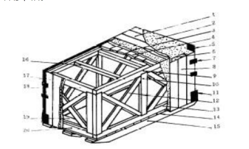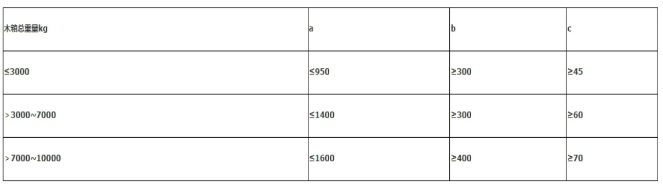 4.10.3采用胶合板作底板时,应由枕木承载,底板厚度应符合有关标准的规定。 4.11框架 4.11.1载重量1000kg以上的框架箱,其框架的结构形式根据箱长宽与箱高选取。 4.11.2框架的立柱截面尺寸,可按其高度和允许负荷求得。 示例:某机器设备包装木箱,箱长6000mm,箱宽2500mm,箱高1700mm,故立柱之间的距离为6000mm÷4=1500mm,立柱允许负荷P=5×10–3BL=5×10–3×2500×1500=18750N。 若枕木与滑木高度之和为400mm,则立柱高度为1700–400=1300mm。根据上述计算得立柱截面尺寸应为60mm×100mm。 4.11.3梁木可取与立柱相同的截面尺寸,梁撑可选用立柱截面2/3的尺寸或与立柱截面相同的尺寸。 4.11.4梁木允许拼接,接口要在支撑与立柱交汇处。 4.12箱板 4.12.1箱板厚度。 4.12.2箱板拼接形式应根据产品的特点拼接应严紧。 4.12.3箱板宽度应不小于80mm。 4.12.4侧板要盖住滑木高度的2/3,箱板一般应竖放。 4.12.5所用箱板色泽应基本一致,表面应平整。 4.13箱顶 4.13.1顶方原则上应均匀排布,并根据箱体内宽,可在顶方间增加梁撑。梁撑的宽度不小 于50mm,厚度不小于顶方厚度的2/3。 4.13.2顶方截面尺寸按机床重量与箱宽尺寸。 4.13.3当起吊绳索正好通过侧上框木,且箱体较长时,应对箱顶进行加强处理。 |